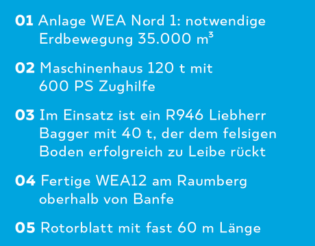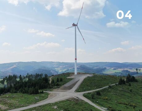 Die Anlage Nr. 12 fügt sich nahtlos in den bestehenden Windpark ein und ist vom gleichen Typ wie an den Standorten 9 und 10 ganz oben auf dem Armen Mann: 137 m Nabenhöhe bei einer Leistung von 3,3 Megawatt. So geht Stromerzeugung in Bad Laasphe!