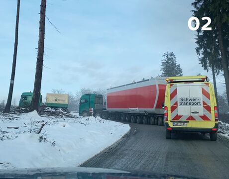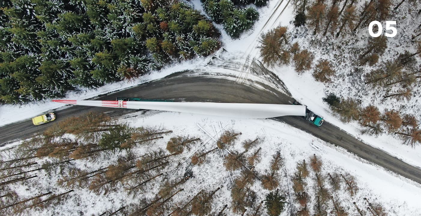 Dank des engagierten und unermüdlichen Einsatzes unserer Mitarbeiter Lothar Knebel und Jörg Weyand konnten alle Voraussetzungen geschaffen werden, um einen Transport der Anlagenteile im geplanten Zeitrahmen zum Standort sicherzustellen. Über mehrere Tage hinweg hat das motivierte Team bereits früh am Tag zunächst die Zuwegung von Schnee und Eis befreit und Splitt verstreut. Schließlich mussten die Anlagenteile von bis zu 120 t Gewicht und 60 m Länge mit den Spezialtransporten an ihren Standort gebracht werden. Zwischendurch war es erforderlich, die Wege immer wieder in Ordnung zu bringen, da sie unter den extremen Witterungsbedingungen und den hohen Lasten stark beansprucht und in Mitleidenschaft gezogen wurden.