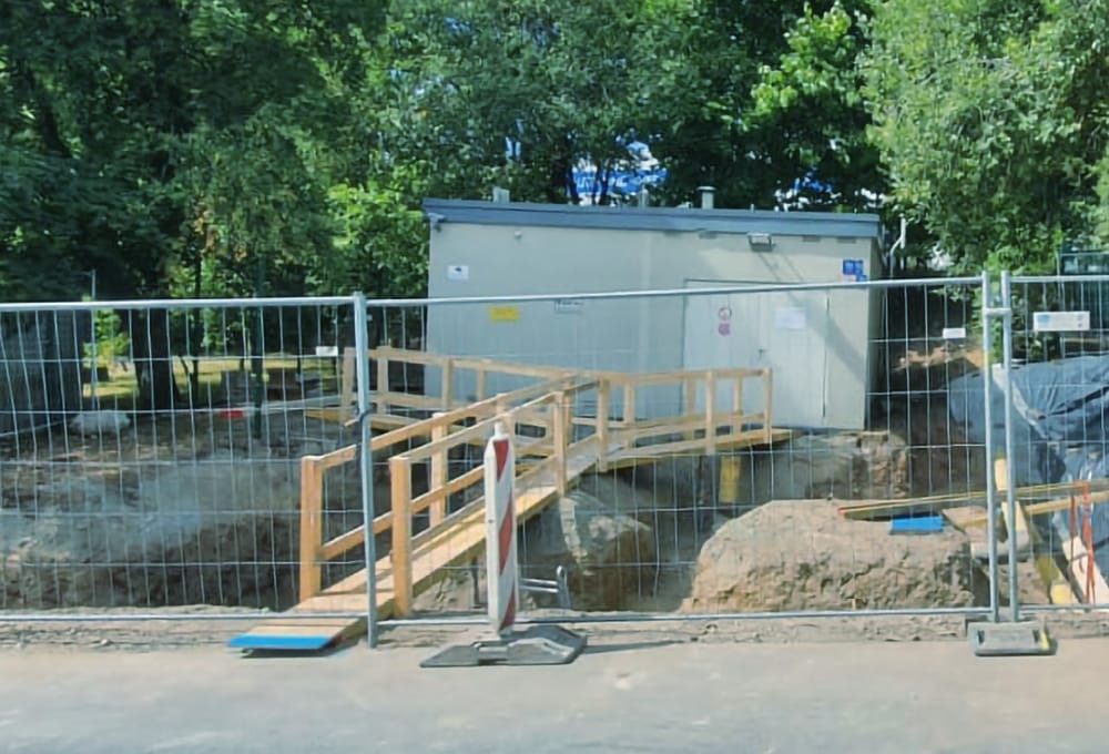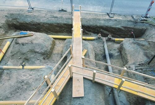 Neben den Tiefbauarbeiten war es vonnöten, die freigelegten Gasleitungen zu sichern und eine provisorische Zuwegung zur GDRM-Anlage über die Grube zu bauen. Nach Beendigung der Verfüllarbeiten wurde die Fläche vor der Anlage neu gepflastert und die Schieberkappen in die Pflasterfläche eingebaut. So sind die neuen Absperrarmaturen im Störungsfall gut erreichbar.